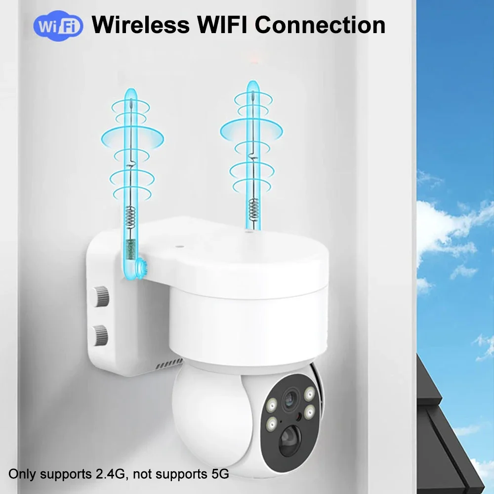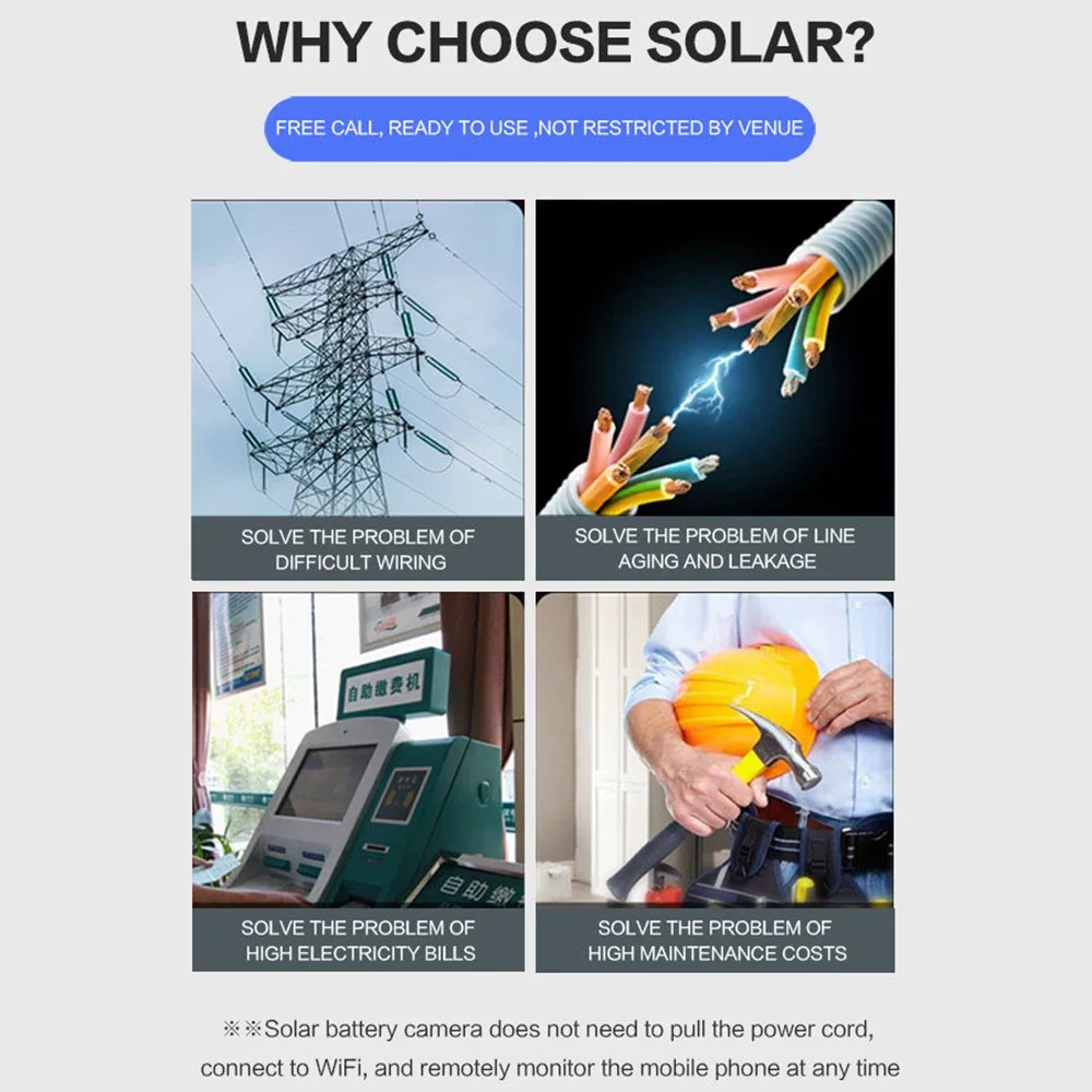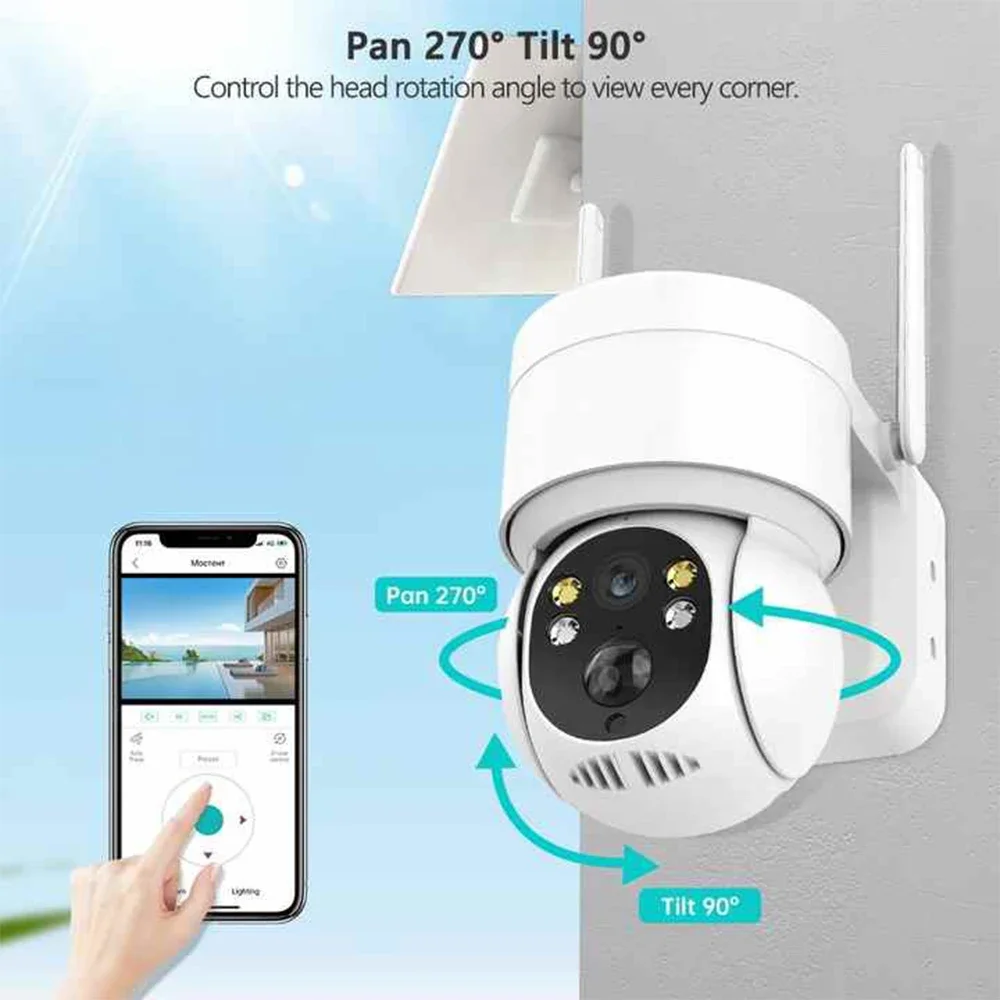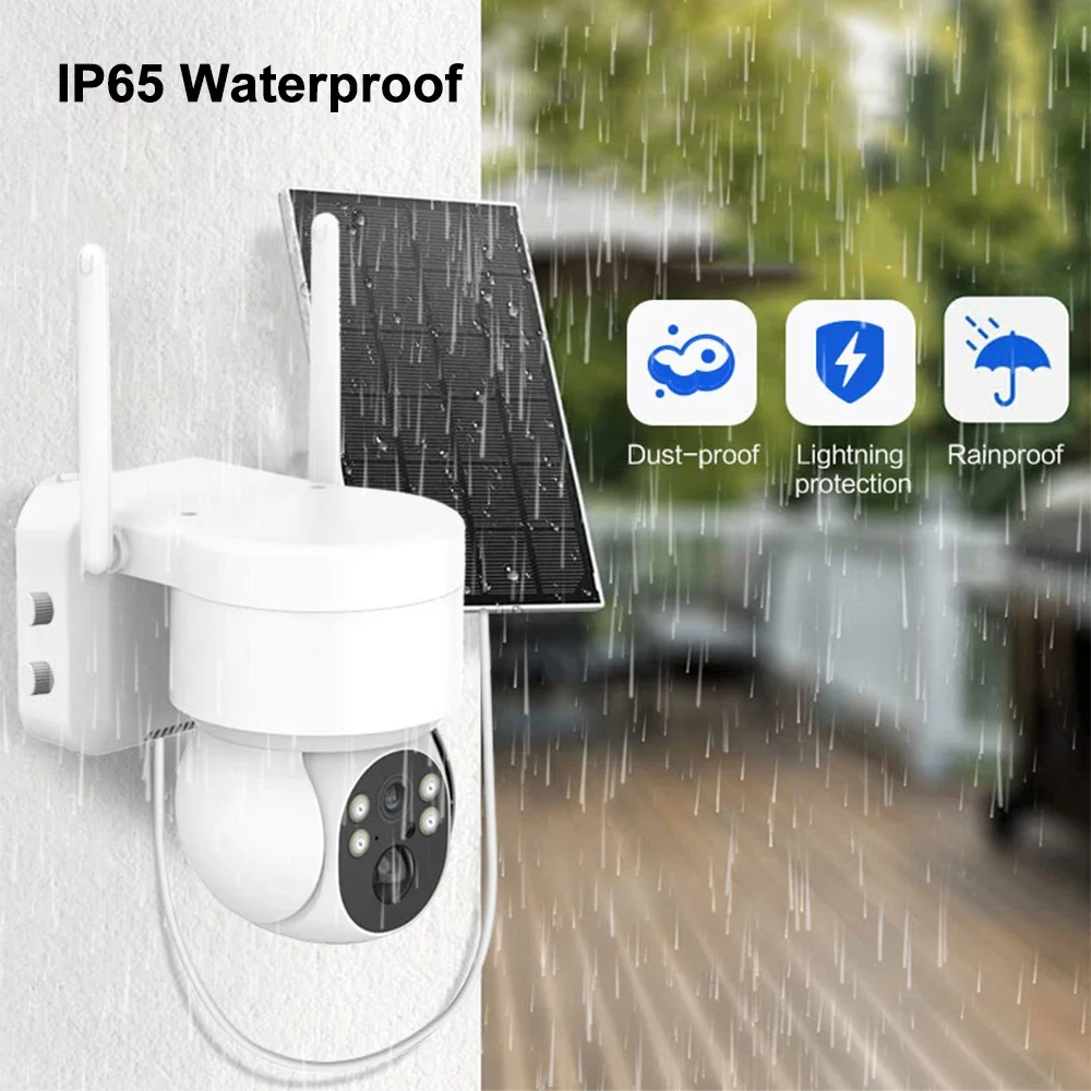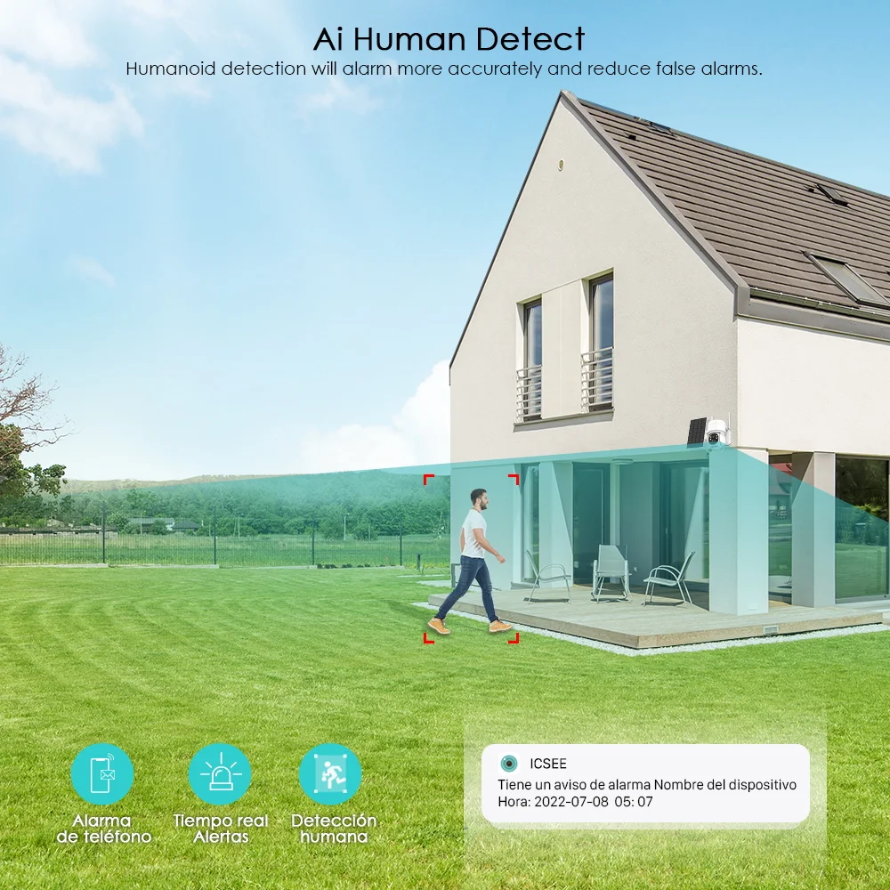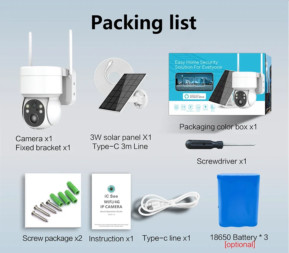 4MP Outdoor WIFI Solar Camera Security with Solar Panel Wireless Surveillance PTZ Battery CCTV PIR Human Detection ICsee AlexaFeatures*Built-in 7800mAh Battery/Provides long-lasting working hours *3W Solar panel/Provides power to the battery *Ultra-low power standby/Auto-sleep and fast wake-up *4x digital zoom/ view more detailed images, zoom in and out at any time through APP *Full-color Night Vision/High-performance ISP and 1/2.7″ progressive sensor *4MP HD video/Provide higher HD real picture quality *AI Motion detection/identify abnormal human behavior *Support 2.4G WIFI/stable transmission signal *Perfect two-way audio effects/echo cancellation and noise suppression technology *PTZ remote control / pan 355° tilt 90° / get the best shooting angle *IP65 waterproof/good operation in – 20 ℃ and+60 ℃ environment (4°F-140°F) *Support All-in-One installation and separated installation *Support Micro SD card / store more data and content,Up to 128G *Support for cloud services/data security and safety (subscription required) *Support multi-user viewing/sharing with family*APP:ICsee& XMEye/Free APP upgrade and technical supportProduct List1 x Wifi Solar Camera 1 x Solar Panel 1 x Solar Panel Bracket 1 x User ManualWhy choose solar camera?Solar camera has very many advantages, avoid complex wiring arrangement, easy installation, save electricity cost, it is your wise choice4MP HD lensThe camera has a 4 MP HD lens, greater light perception, even in low light conditions can be well recorded100% wireless cameraThe camera comes with a built-in battery and can be connected to a solar panel for charging and use, allowing for wireless installation3W Solar Panel, Efficient Solar Charging*When the security camera connected to 3W solar panel to work, the battery can last 365 days, also works even with sunlight *The solar panel can provide non-stop power for the outdoor camera. *Please make the sure the solar panel is connected well with the battery camera, the connector should be covered carefully7800mAh Rechargeable Battery*7800mAh Rechargeable Battery & 100% power wire-free *Beside, the solar panel can provide non-stop solar power for the outdoor camera day or night, sunny or rainy. *With rechargeable battery, it allows you no need any annoying wires for the ptz outdoor camera. 100% wire-free. *Low battery notification and indicator on the WiFi security cameraAI Human Detection*Allowing you to monitor what matters without receiving annoying false alerts, get real-time accurate alert notifications in your mobile phone.4X Digital Zoom* Just use your finger to hold the mobile phone screen and expand outward, to Zoom in/out the live video image. This IP camera can clearly see more zoom details with a HD picture, bringing you a better visual experience that is unsurpassed by other products in the market. Realize to see bigger details of distant objects without getting close.PTZ Remote Control On The Phone* You can easily control the PT camera to rotate 355° horizontally and 90° vertically to cover every angle of your house. Just with only a mobile phone, you can Remotely monitor the whole front door or store via this WiFi camera.Two Way Audio Communication*You will get a CCTV camera with microphone and speaker. You can talk with your family at any time, anywhere like working, traveling, or on a business. *Give you pease of mind and 24-hour security protectionIP65 Waterproof* With IP65 great weatherproof performance, this wireless WiFi camera can prevent water from seeping into the camera and withstand a temperature range from -10°C to 60°C, which is able to withstand more difficult and extreme conditions like wind, rain, snow. Give your home security continuous 24 hour per day video surveillance.2.4G WiFi Camera VersionYou can connect the camera to the router for networking via wifi, only supports 2.4G wifi (5G not supported)Color Night Vision*See everything in detail in day and night *With 4 megapixels CMOS sensor *This security camera has 3 modes of night vison: Color, IR, auto night vision.H.265 Image CordingThis CCTV WiFi camera support H.265 image cording, save more storage spaceSupport video playbackSupport SD Card And Cloud Storage*The record video could be click to check in the app *If you like the cloud storage, you can contitue to buyMulti-user Sharing*In support of remote monitoring with 3~4 users at the same time, you can share the scenes with your family and friends.Suitable for more scenariosProduct details