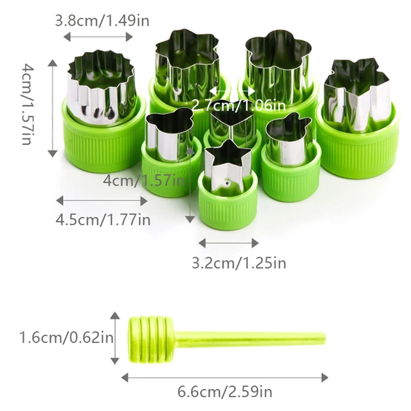 Features:1. This mold is made of food grade stainless steel with polished surface, which is safe and durable.2. Humanized design, the cover is made of plastic, smooth and round, easy to press, non-slip, to avoid accidental scratches.3. The cover of the mold is easy to disassemble and clean, and it is more convenient to maintain hygiene.4. The sharp edge of the knife can easily cut out beautiful shapes, and a variety of shapes are available, and it is an ideal kitchen tool.5. Wide range of applications, suitable for making biscuits/vegetables/fruits/butterfly noodles/sausage shape, etc.Specification:100% brand new qualityItem Name:Stainless Steel Fruit CuttingMaterial:Stainless Steel+PP HandlesColor:As the picture showSize:As the picture show(1inch = 2.54cm)Package includes:5/8/12Pcs Stainless Steel Fruit CuttingNote:1.Due to the different monitor and light effect, the actual color of the item might be slightly different from the color which is showed on the pictures.2.Please forgive 1 cm/0.39″-3 cm/1.18″ measuring deviation due to manual measurement.