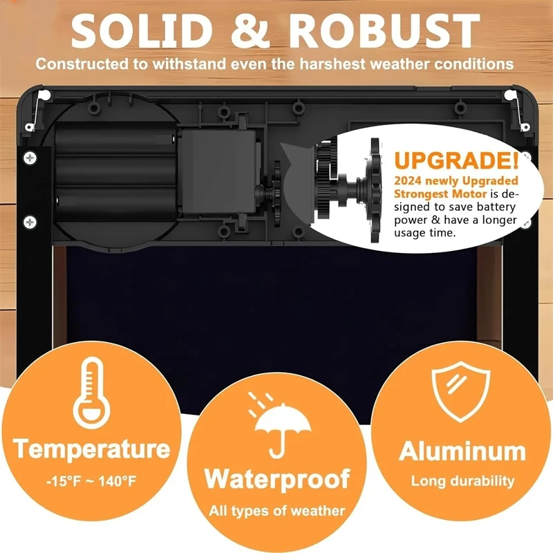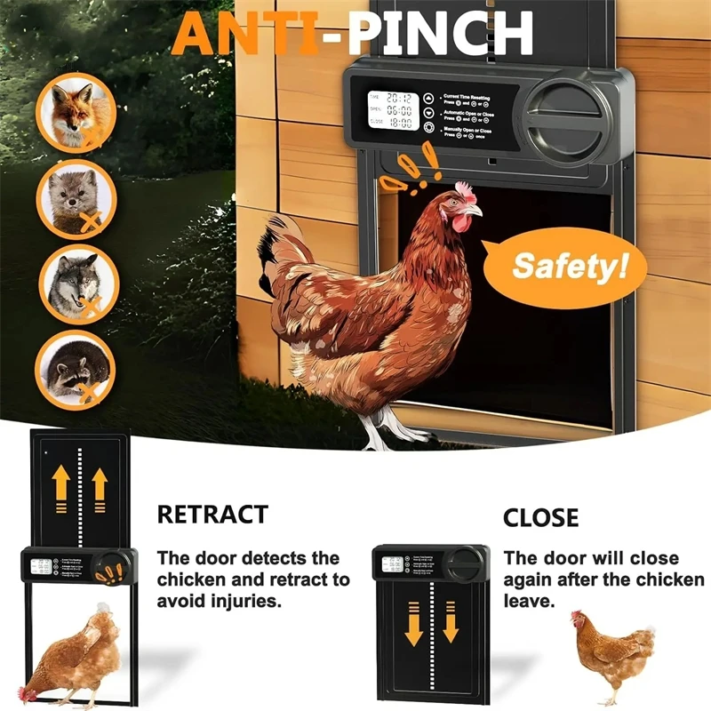 Black Version DescriptionSimple installationIt takes no more than 10 minutes to install the automatic door opener (no complicated wiring or wiring is required).Strong and durableThe automatic chicken coop door is made of professionally painted high-quality aluminum alloy. The long-term use of the chicken coop door is strong and durable. It can effectively prevent the invasion of natural enemies, such as wolves, hyenas and foxes, and protect your chickens from natural enemies.Easy to useUse buttons to easily program.The time to switch the chicken door can be freely set according to the local time using the 24-hour clock.The LCD large-screen display is clearly visible.Anti-pinch protection designOur chicken coop door adopts anti-pinch design! When the built-in sensor detects a chicken under the door, the automatic door will stop to prevent the chicken from being harmed. The door will continue to close. Don’t worry about hurting the cute chicken.Rainproof and water-proof functionThe product is designed according to IPX3 waterproof, which can prevent general rainwater from entering the interior of the machine.Low power consumption and long standby time3xAA battery compartment(3 AA batteries not included), easy to replace, longer use time.