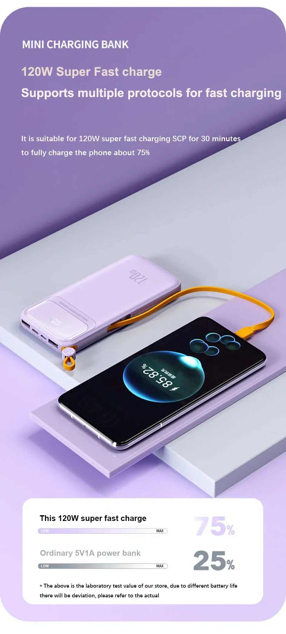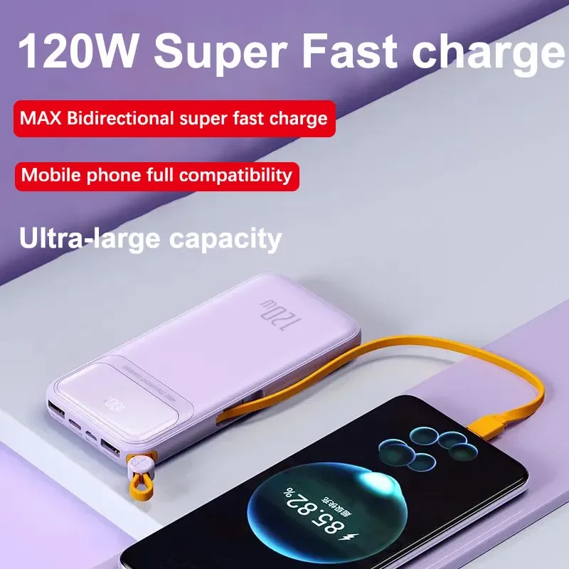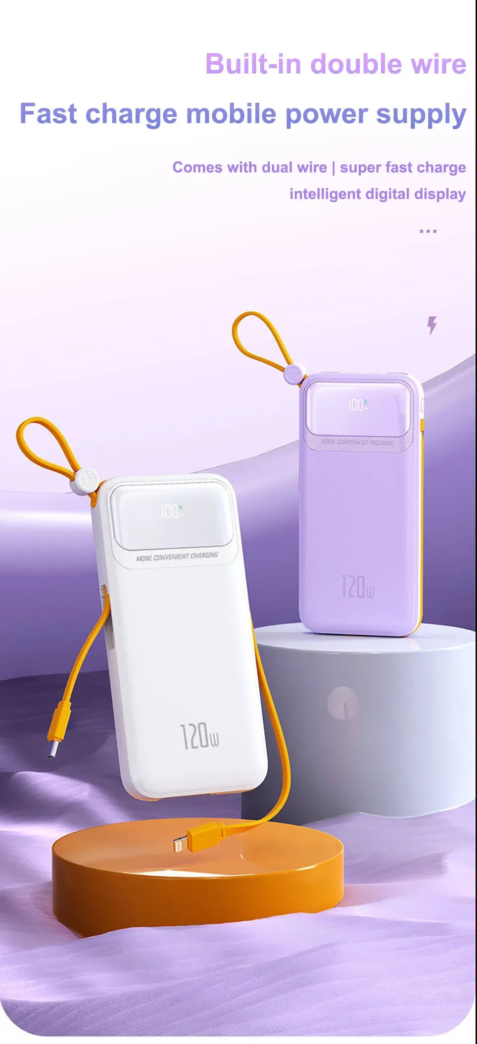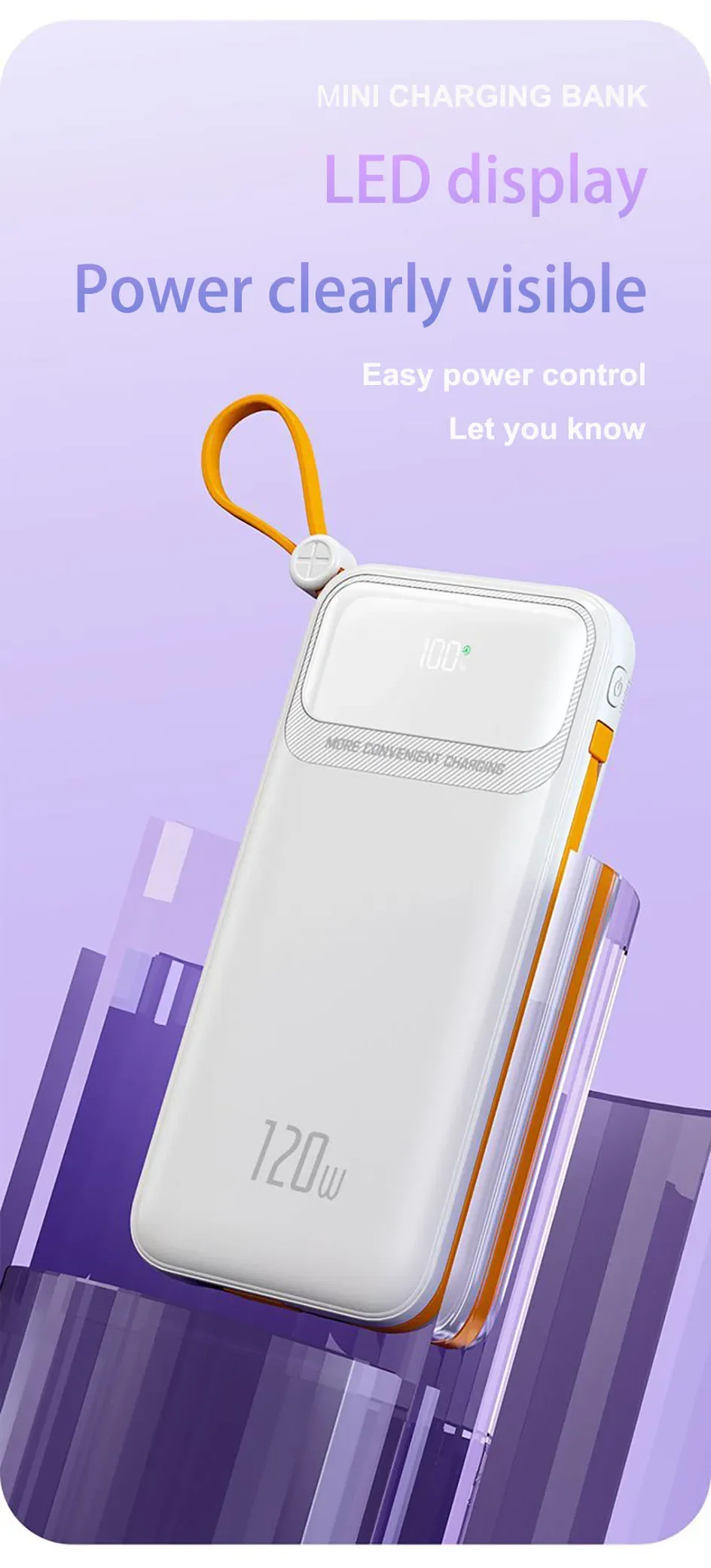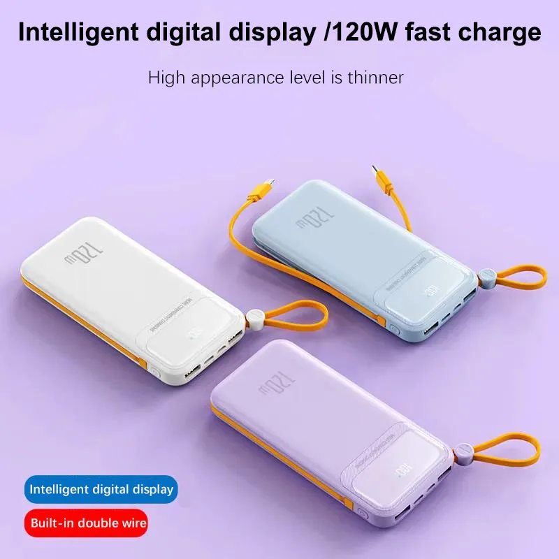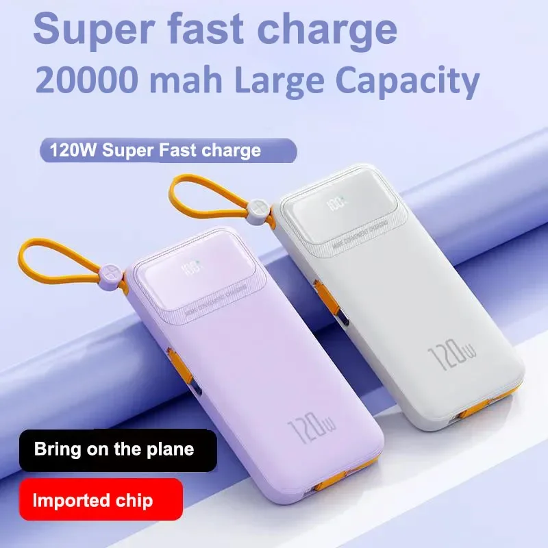 High Speed 120W Power Bank 20000Mah Powerbank with Data Cable Large Capacity Super Fast Charge Mobile Battery for IPhone Samsung Product details Battery capacity: 20000Mah Charging bank: comes with cable charging bank Output mode: Type-C, Lighting Type: type-c, Android Type-C Input: 5V/2A,9V/3A, 5V/4.5A, 12V/1.6A 5V/3A Lightning output: 5V/2A, 5V/4.5A, 12V/1.6A 5V/3A Type-C Output :5V/2A,9V/3A, 5V/4.5A, 12V/1.6A 5V/3A USB output: 5V/2A,9V/3A, 5V/4.5A, 12V/1.6A 5V/3A Digital display: Display power Features: Comes with Charge Cable Color: Black, white, pink, purple Applicable brands: Apple, Samsung, Huawei, Xiaomi, MOTOROLA, etc Applicable products: Mobile phone, headset, tablet, computer