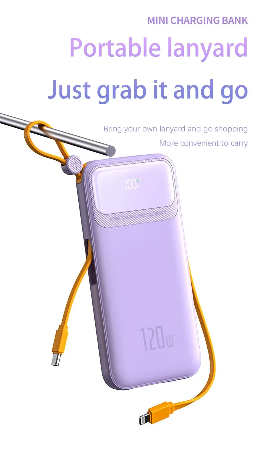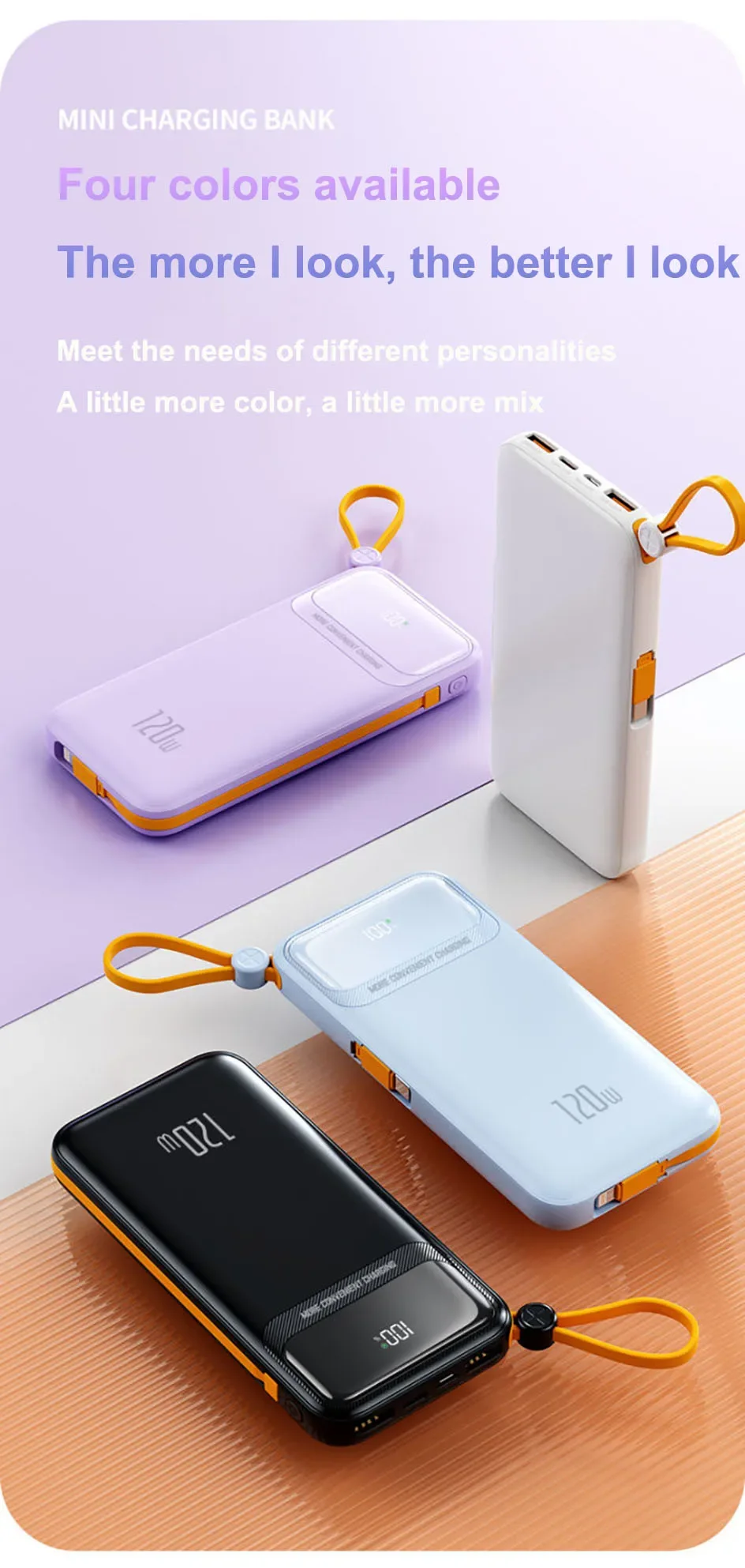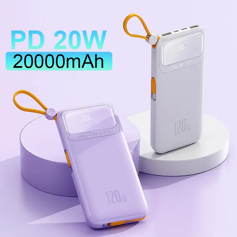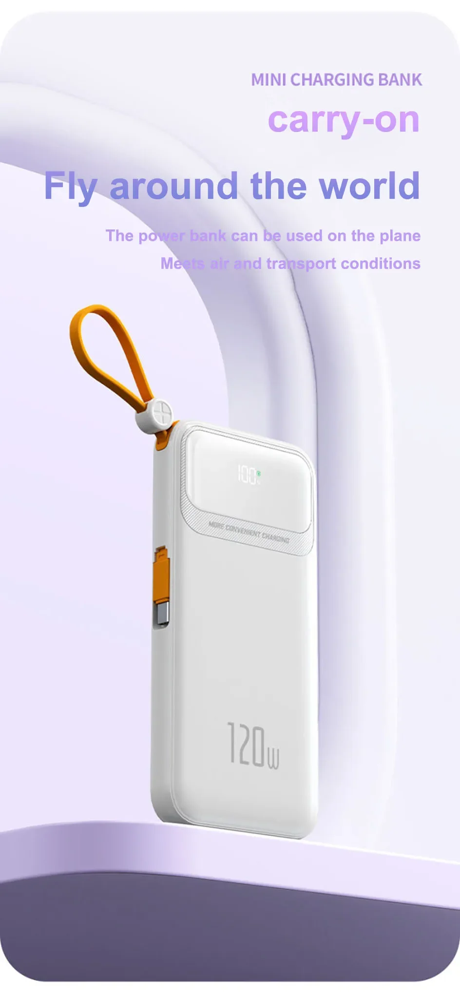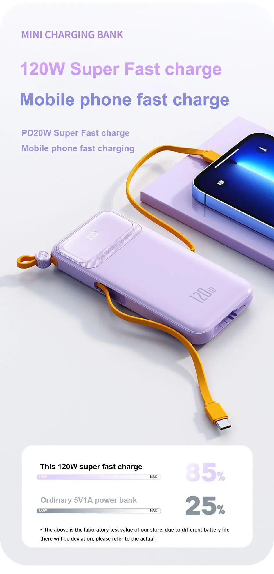 High Speed 120W Power Bank 20000Mah Powerbank with Data Cable Large Capacity Super Fast Charge Mobile Battery for IPhone Samsung Product details Battery capacity: 20000Mah Charging bank: comes with cable charging bank Output mode: Type-C, Lighting Type: type-c, Android Type-C Input: 5V/2A,9V/3A, 5V/4.5A, 12V/1.6A 5V/3A Lightning output: 5V/2A, 5V/4.5A, 12V/1.6A 5V/3A Type-C Output :5V/2A,9V/3A, 5V/4.5A, 12V/1.6A 5V/3A USB output: 5V/2A,9V/3A, 5V/4.5A, 12V/1.6A 5V/3A Digital display: Display power Features: Comes with Charge Cable Color: Black, white, pink, purple Applicable brands: Apple, Samsung, Huawei, Xiaomi, MOTOROLA, etc Applicable products: Mobile phone, headset, tablet, computer