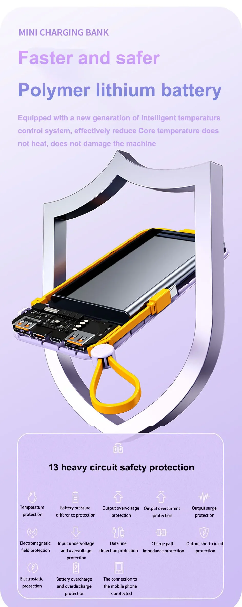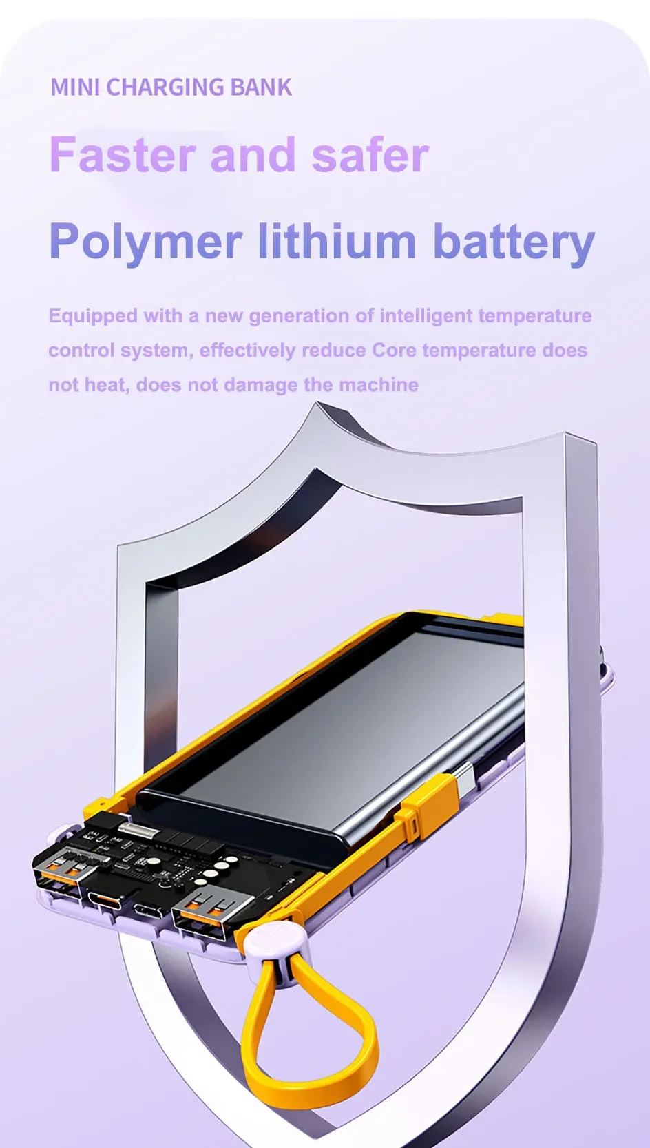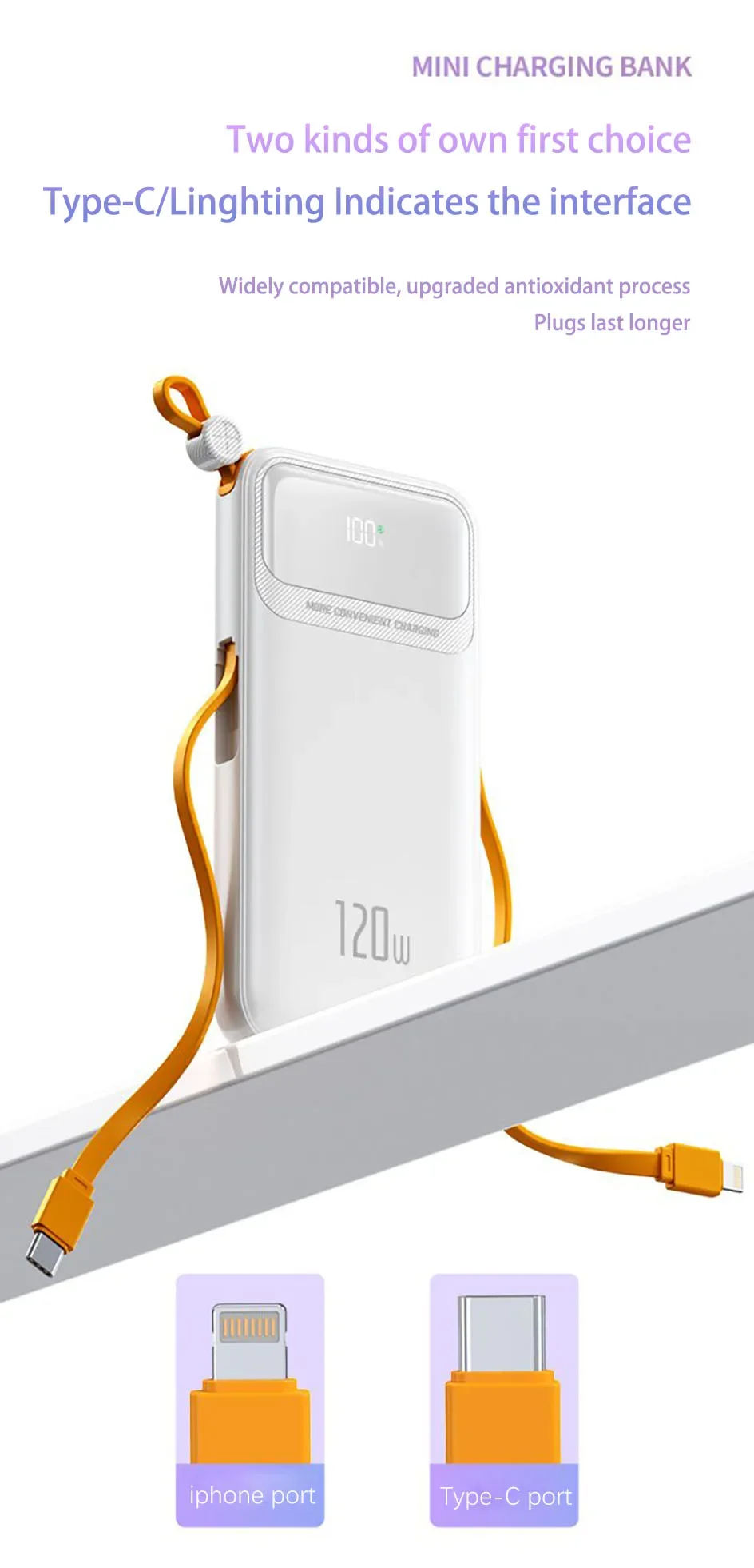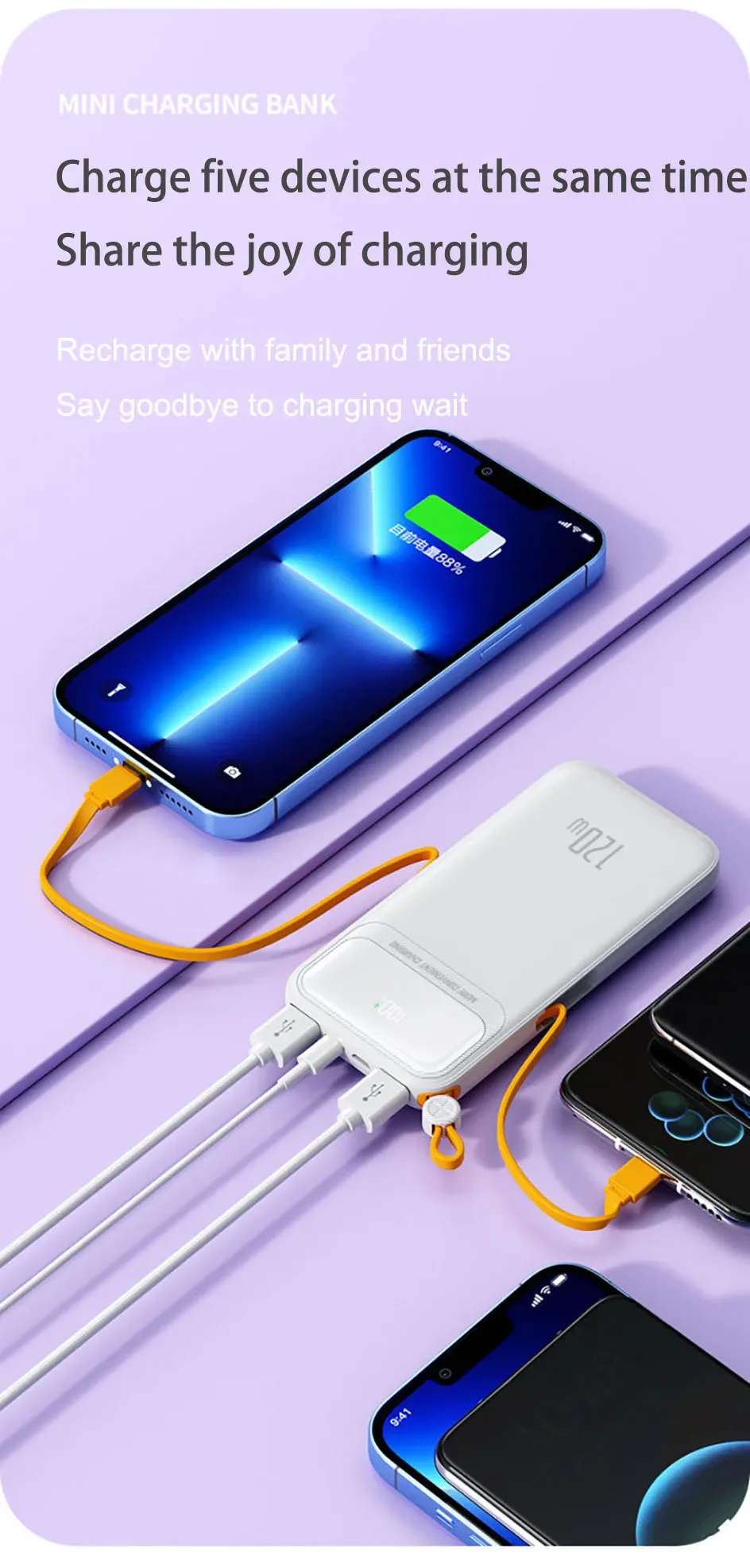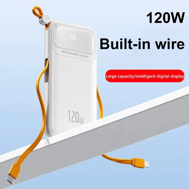 High Speed 120W Power Bank 20000Mah Powerbank with Data Cable Large Capacity Super Fast Charge Mobile Battery for IPhone Samsung Product details Battery capacity: 20000Mah Charging bank: comes with cable charging bank Output mode: Type-C, Lighting Type: type-c, Android Type-C Input: 5V/2A,9V/3A, 5V/4.5A, 12V/1.6A 5V/3A Lightning output: 5V/2A, 5V/4.5A, 12V/1.6A 5V/3A Type-C Output :5V/2A,9V/3A, 5V/4.5A, 12V/1.6A 5V/3A USB output: 5V/2A,9V/3A, 5V/4.5A, 12V/1.6A 5V/3A Digital display: Display power Features: Comes with Charge Cable Color: Black, white, pink, purple Applicable brands: Apple, Samsung, Huawei, Xiaomi, MOTOROLA, etc Applicable products: Mobile phone, headset, tablet, computer