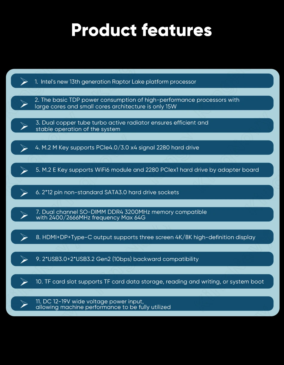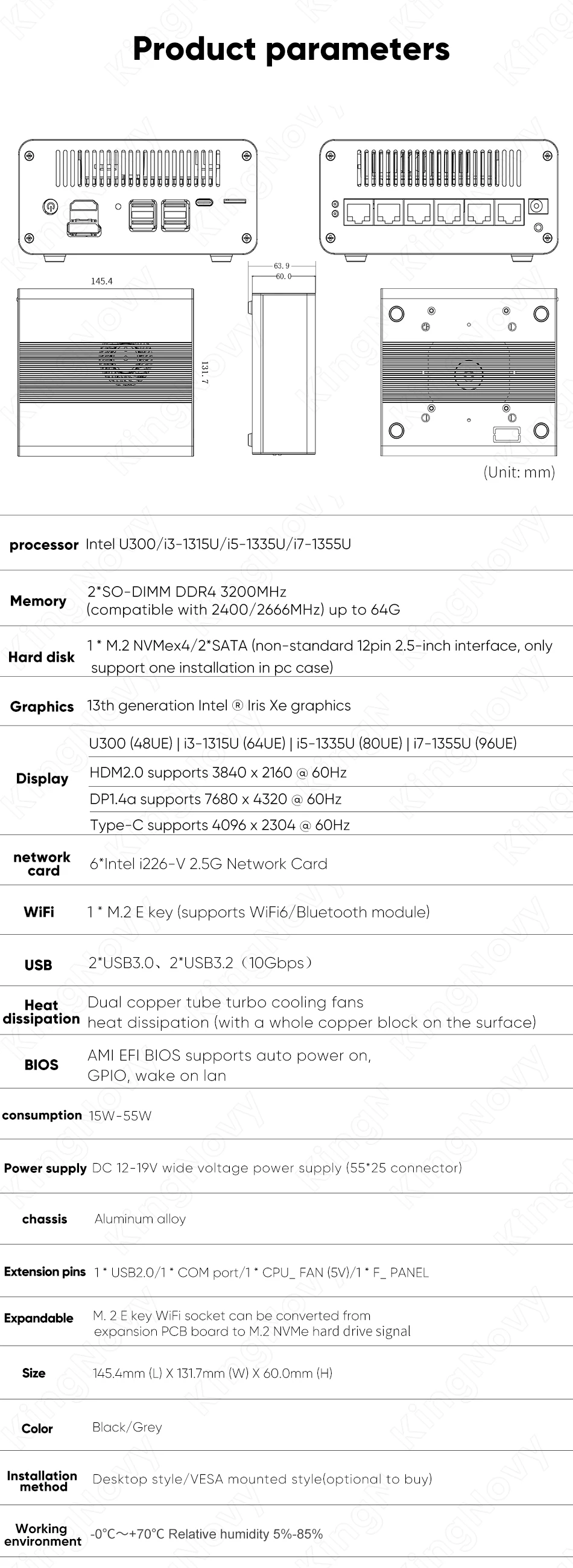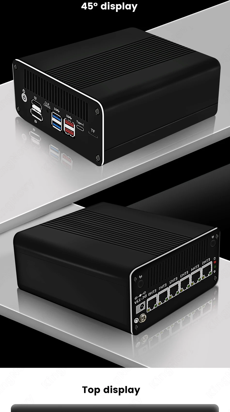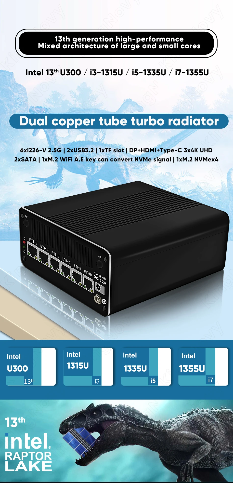 Processor parameter for referance only Product Highlight-6xIntel i226-V 2.5G UDE filter pure RJ45 LANs, 2xUSB3.2 Gen2(10Gbps), 2xUSB3.0, 1xType-C, 1xTF card slot.-2xDDR4 SODIMM non-ecc ram slot, max 64GB 3200MHz.-Support triple storage: 1xM.2 2280 PCIE4.0/3.0×4 SSD+1xM.2 2280 PCIE3.0x1 SSD+1×2.5”SATA3.0 SSD/HDD.-1xM.2 2232 slot, support WiFi connection, also support transfer to 1xM.2 NVMe/PCIe3.0x1 2280 SSD with PCB adapter board.-TF card slot support storage and system disk boot.-Support three display: 1xHDMI2.1, 1xDP1.4a, 1xType-C, 3x4K@60Hz UHD video display.-Support wide voltage 12-19V input.-Support TPM2.0, AES-NI, ESXI, PVE, Watchdog, Auto power on, RTC, PXE boot, Wake-on-LAN etc.-Low consumption TDP 15W and can be mounted back of monitor by VESA bracket(optional).Package List1xMini PC1xPower Adapter1xPower Cord ( we ship EU/US/UK/AU power plug base on buyer’s address )1xM.2 2232 to 2280 PCB adapter board1xSATA Cable1xScrews BagAll bundles on sale DO NOT include WiFi(antennas), AC WiFi(antennas) cost US $10, AX WiFi6(antennas) cost US $30, internal 8010 fan cost US 9$. If you need, pay at this link.NoticeIntel i226-V is a new network card, suggest to install newest version of following systems with supportable kernel: pfSense-CE 2.7, OPNsense 23.x, pfSense Plus, OpenWrt, ESXi, Proxmox 8.x, CentOS etc. Please make clear before buying, DO NOT open dispute because of system issue.Welcome to click the picture of VESA Bracket to order together if you need: