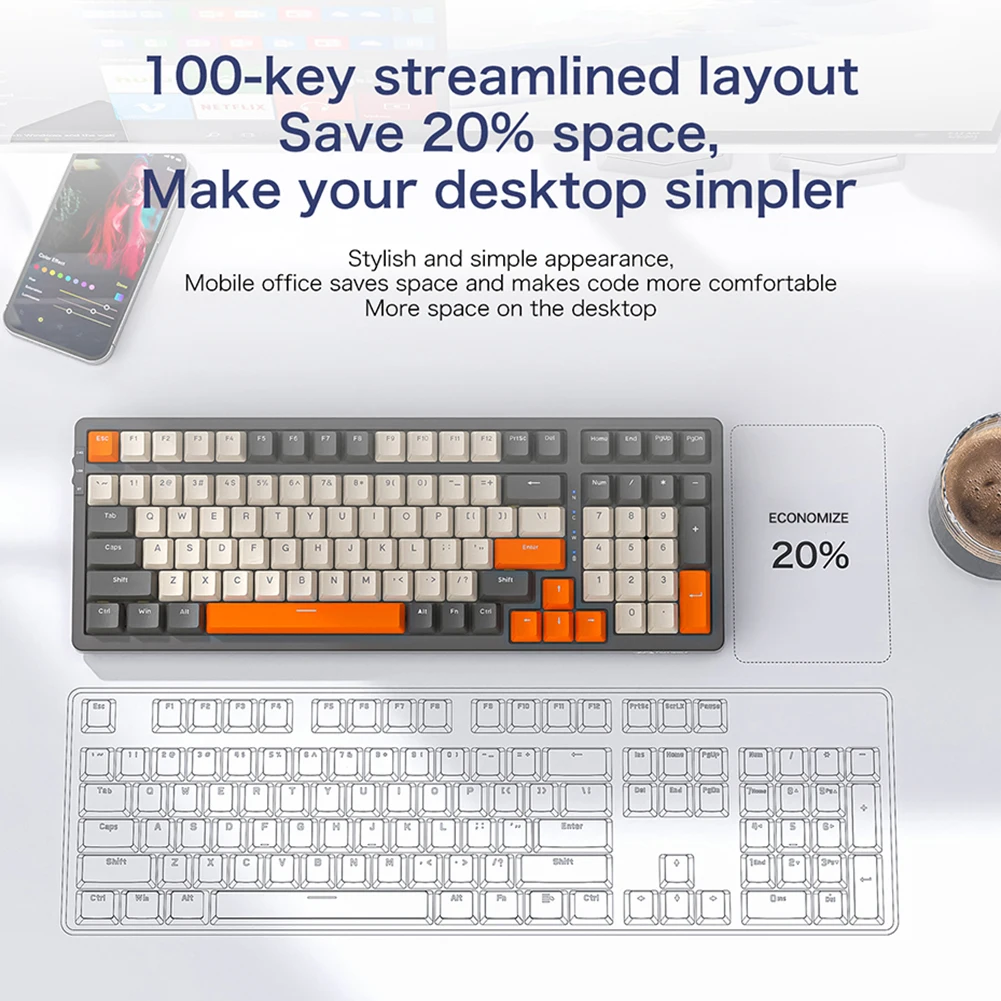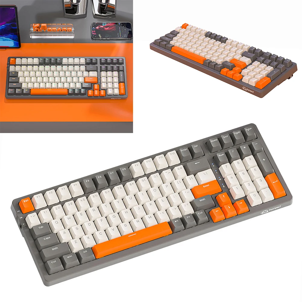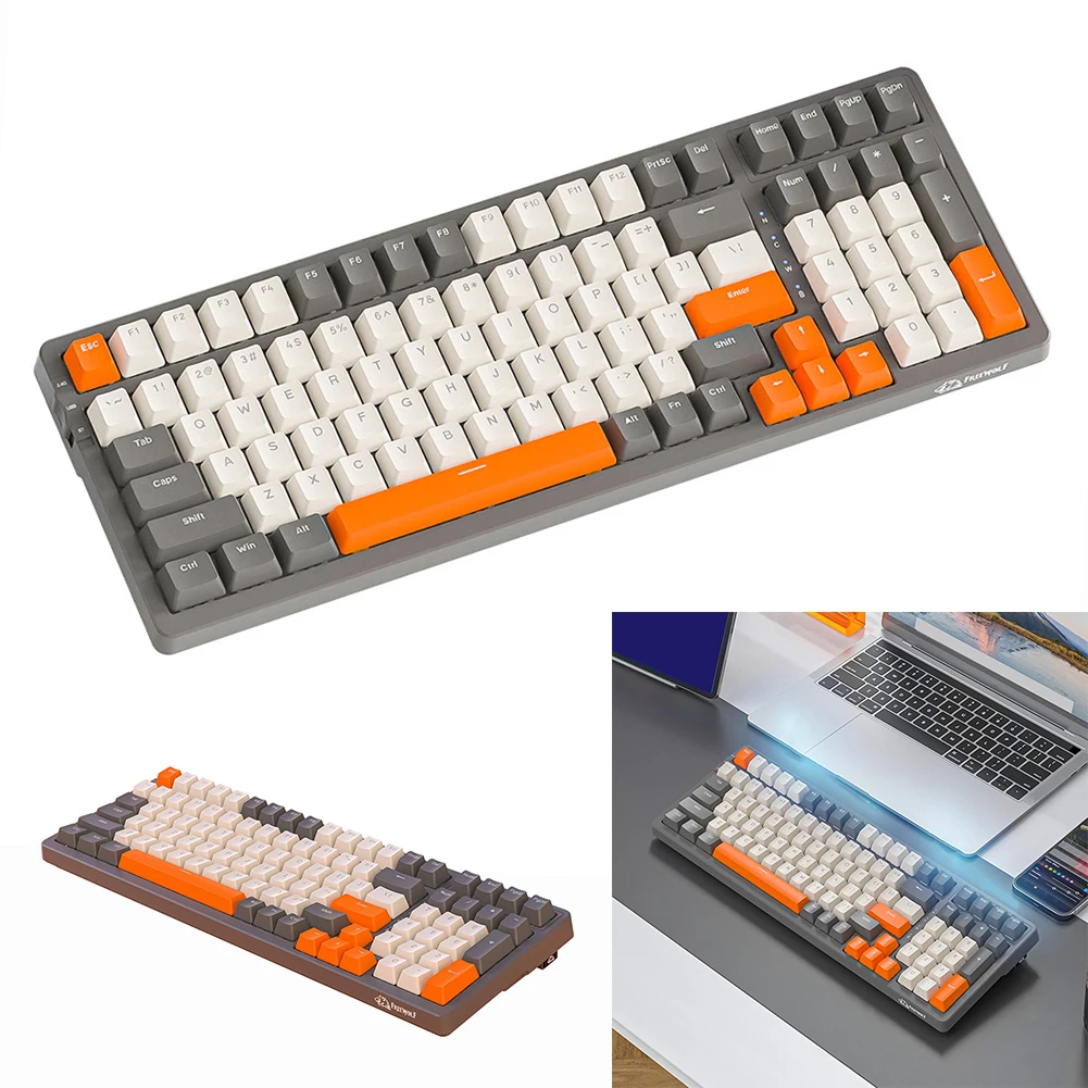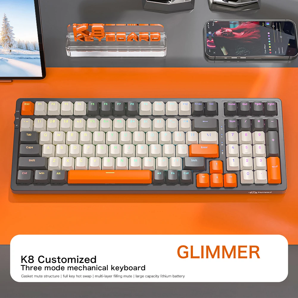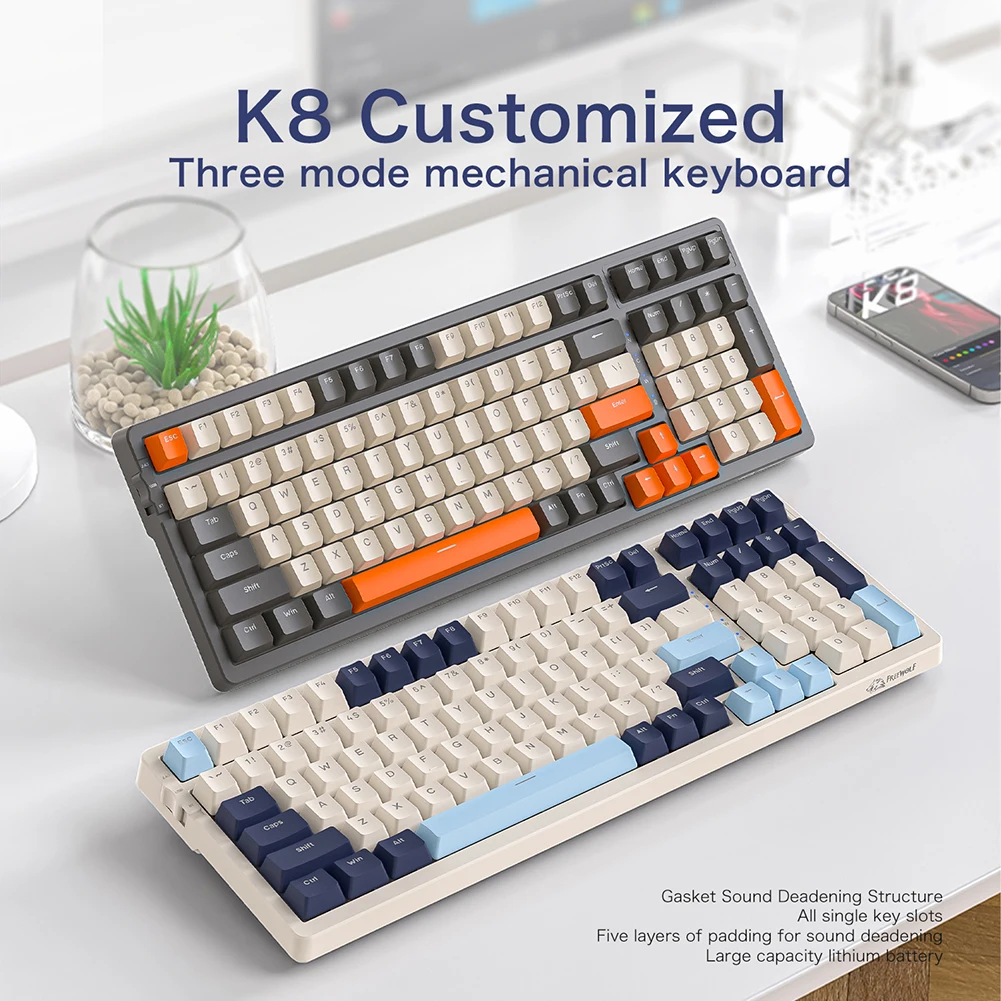 K8 Wireless Mechanical Keyboard Three Modes Hot Swappable Mechanical Keyboard 100 Keys BT/2.4Ghz /Type-C Wired Silent Typing for ESports Gaming Office Feature: 1. Fast Response: Equipped with next-generation wireless transmission technology, this wireless mechanical keyboard ensures faster data transfer and key response, even in complex wireless environments, maintaining a quick and responsive performance. 2. Efficient Silence: With multiple layers of pads, EVA sound-absorbing cotton, and bottom cushion design, this keyboard minimizes hard collisions and cavity noise, providing an efficient and silent typing experience. 3. Space-Saving: Featuring a sleek and minimalist design, this keyboard saves desktop space and provides more usable area for mobile office setups, allowing for a clutter-free and organized workspace. 4. Long-lasting Battery Life: Paired with a high polling rate and a large lithium battery, this hot swappable mechanical keyboard offers low-latency performance and long-lasting battery life. It meets the demands of esports enthusiasts, ensuring worry-free gaming sessions. 5. Multi-function Switching: With support for three connectivity modes (Bluetooth-Compatible 5.0/wireless 2.4G/Type-C wired), this computer keyboard offers a versatile solution for different usage scenarios. Its clean and exquisite design allows users to easily switch between modes according to their specific needs.