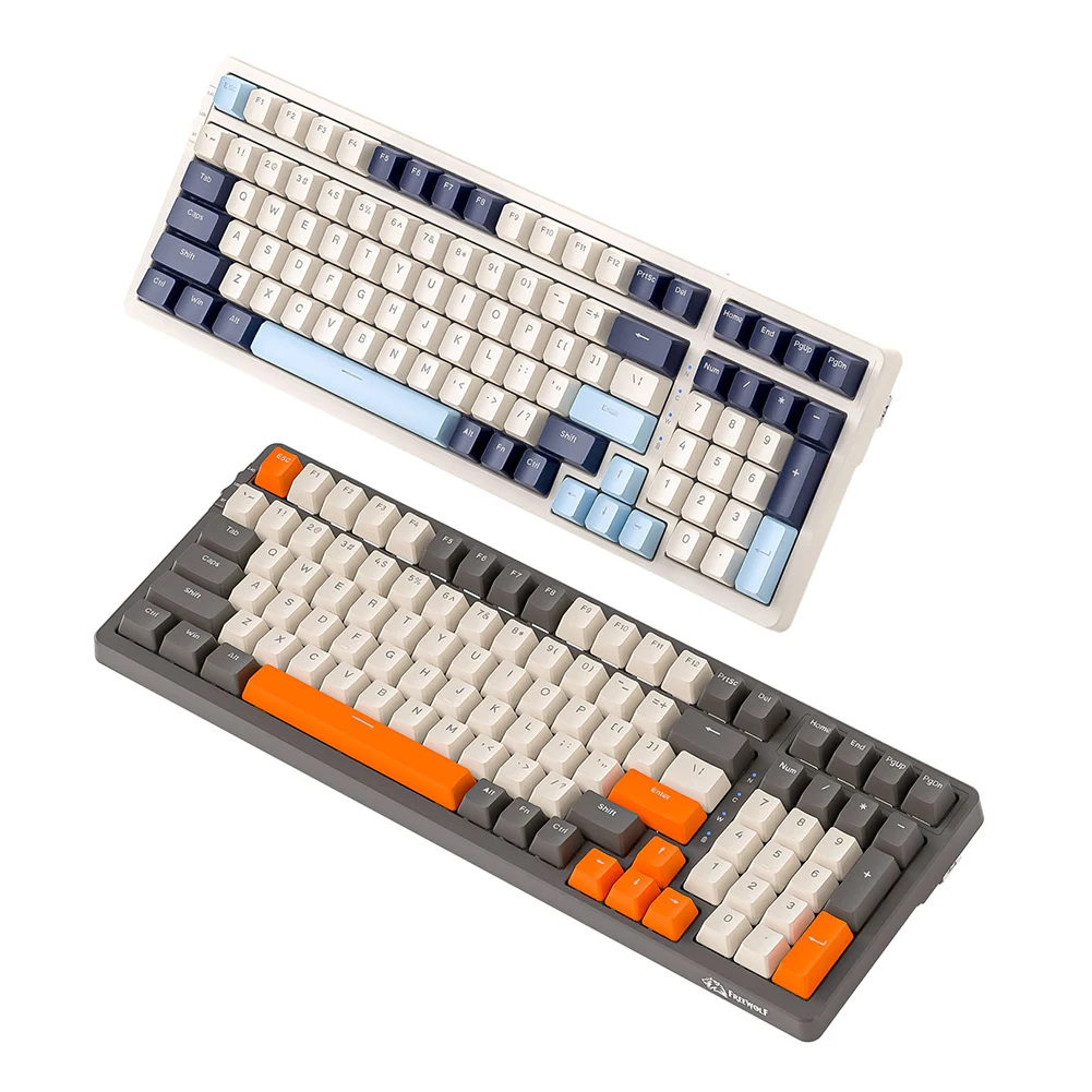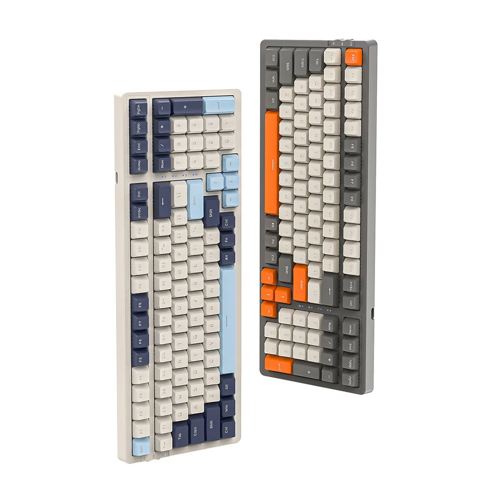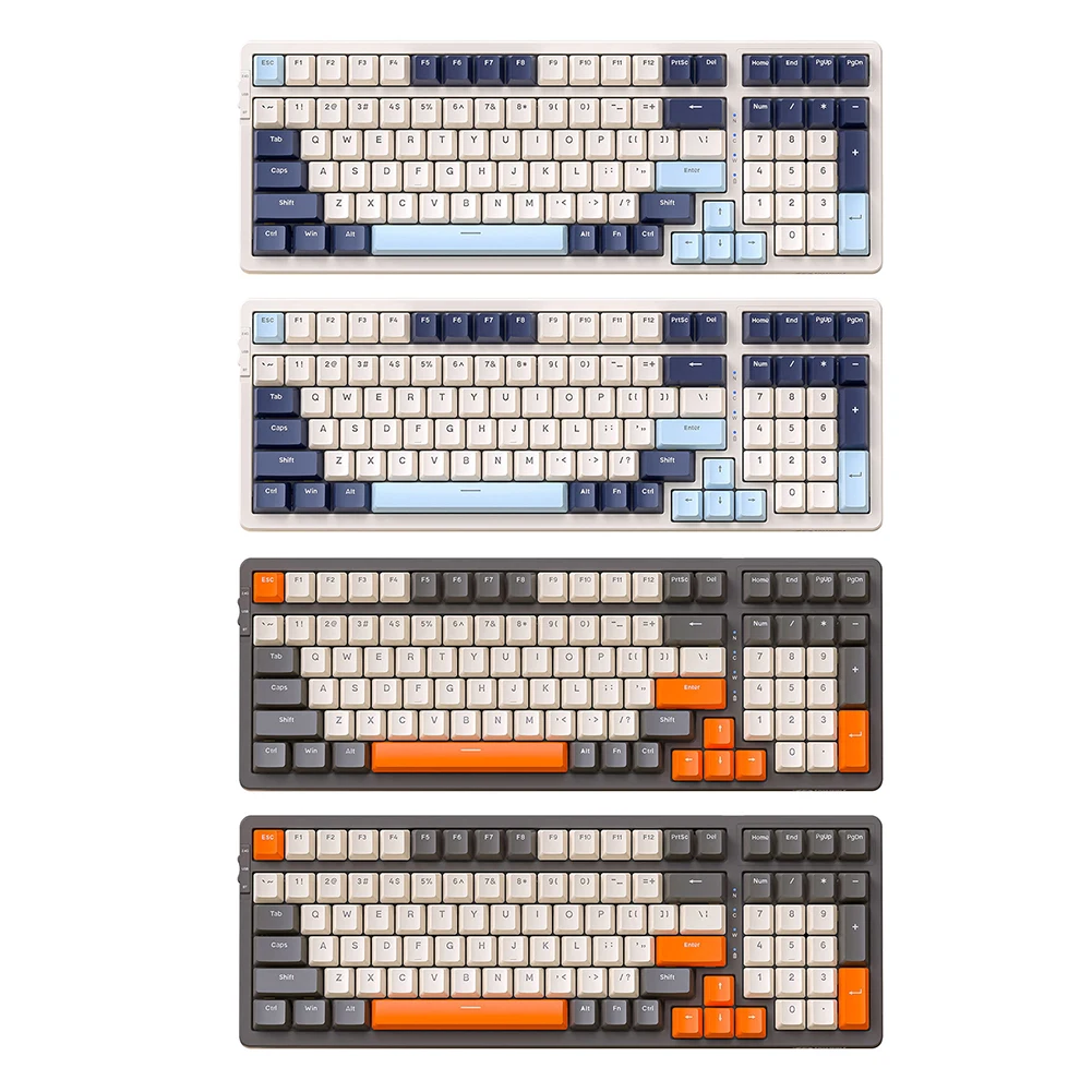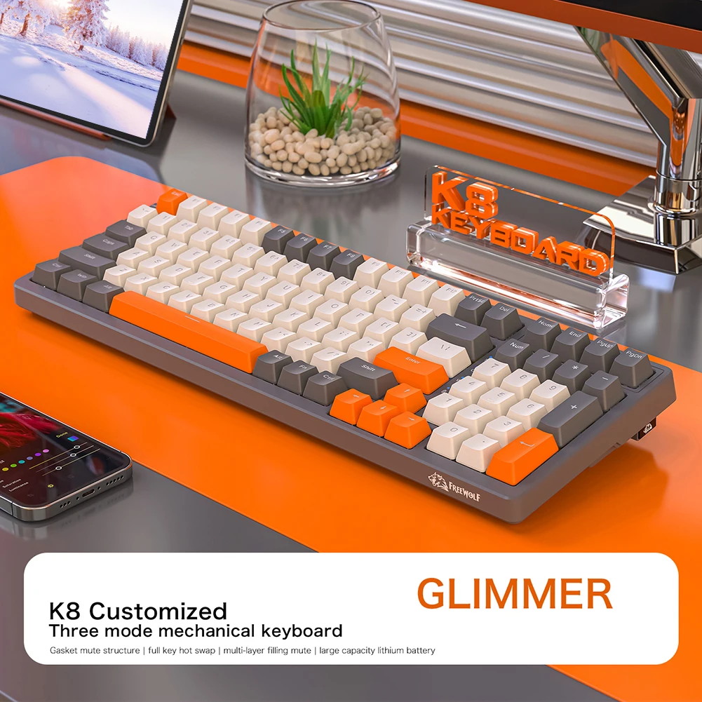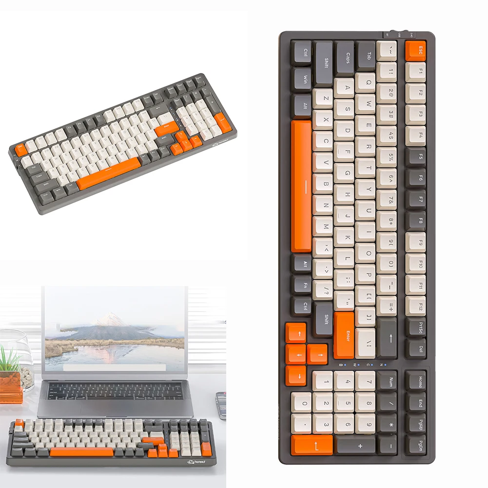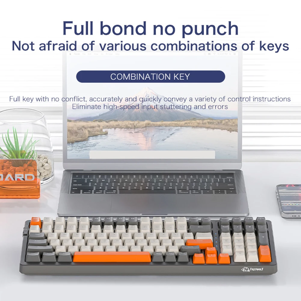 K8 Wireless Mechanical Keyboard Three Modes Hot Swappable Mechanical Keyboard 100 Keys BT/2.4Ghz /Type-C Wired Silent Typing for ESports Gaming Office Feature: 1. Fast Response: Equipped with next-generation wireless transmission technology, this wireless mechanical keyboard ensures faster data transfer and key response, even in complex wireless environments, maintaining a quick and responsive performance. 2. Efficient Silence: With multiple layers of pads, EVA sound-absorbing cotton, and bottom cushion design, this keyboard minimizes hard collisions and cavity noise, providing an efficient and silent typing experience. 3. Space-Saving: Featuring a sleek and minimalist design, this keyboard saves desktop space and provides more usable area for mobile office setups, allowing for a clutter-free and organized workspace. 4. Long-lasting Battery Life: Paired with a high polling rate and a large lithium battery, this hot swappable mechanical keyboard offers low-latency performance and long-lasting battery life. It meets the demands of esports enthusiasts, ensuring worry-free gaming sessions. 5. Multi-function Switching: With support for three connectivity modes (Bluetooth-Compatible 5.0/wireless 2.4G/Type-C wired), this computer keyboard offers a versatile solution for different usage scenarios. Its clean and exquisite design allows users to easily switch between modes according to their specific needs.