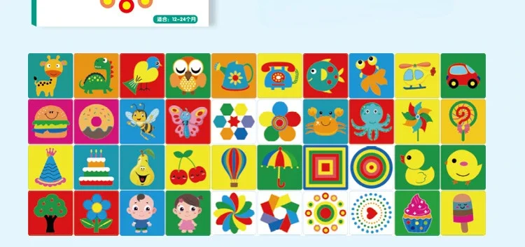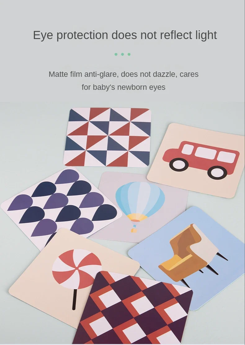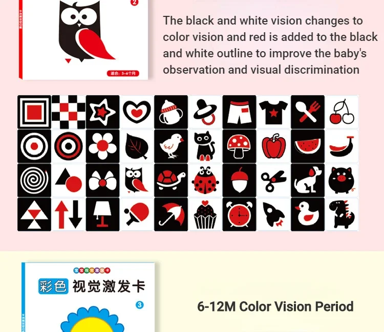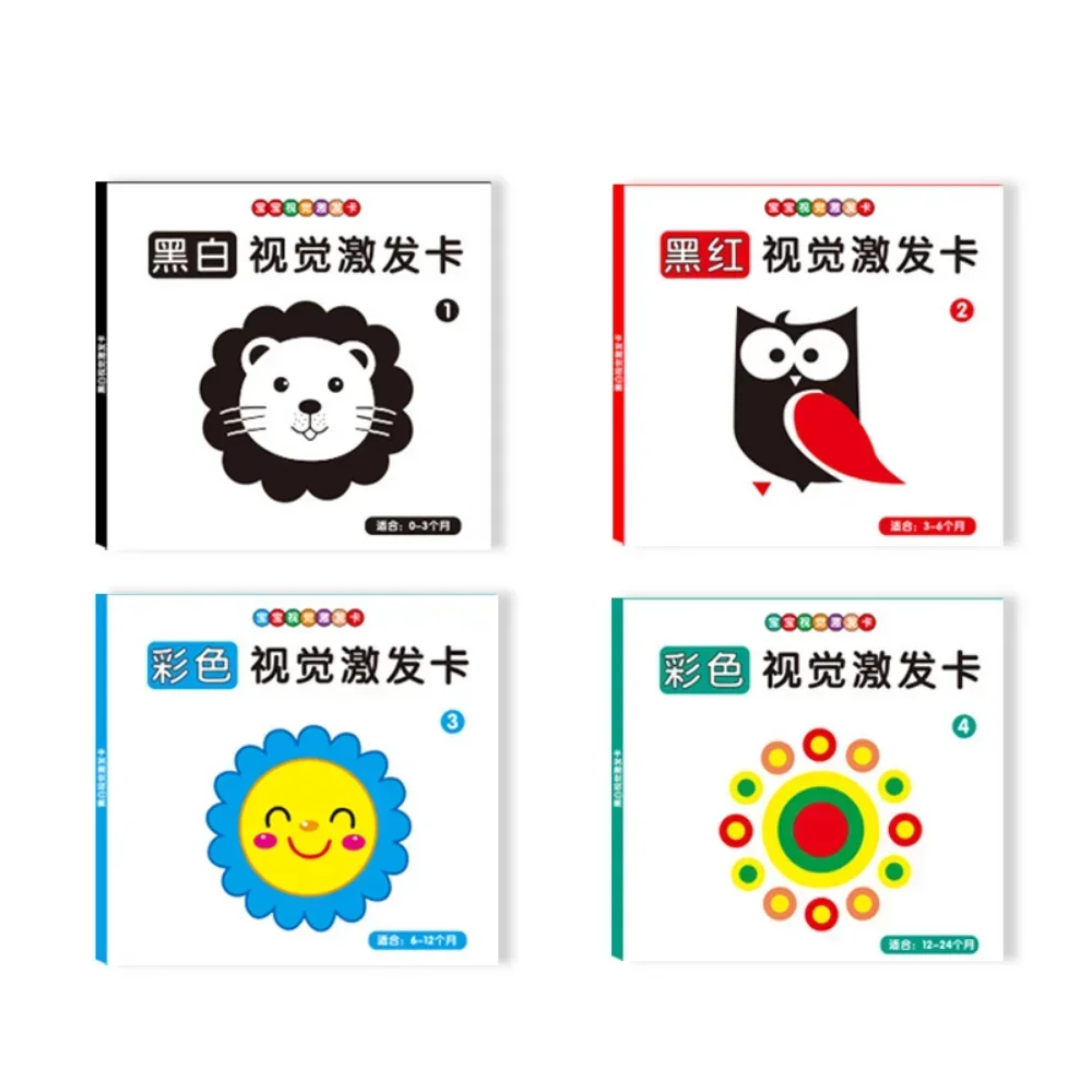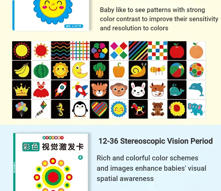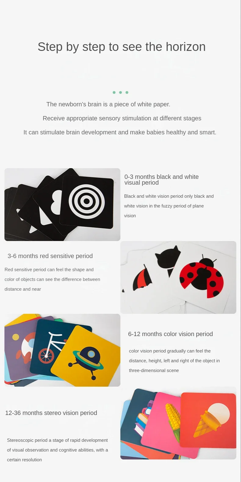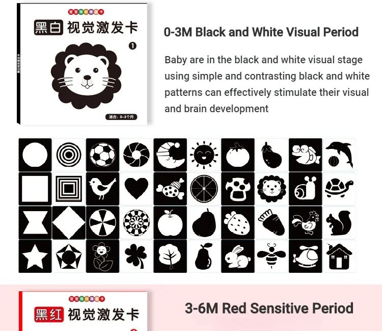Feature:Between the ages of 0 and 3 is the golden age for baby brain development.Activate the baby’s visual nervous system through black and white card and color card Promoting whole brain development and matching light and shade,Perception of graphics.Improve observation, curiosity, and the ability to explore .It’s great for your baby’s vision development and brain development!Harmless to healthSpecification:name: Visual excitation cardPaper thickness: 350 grams of green copper plate cardSize: a volume of 20 sheets, 40 sides Size: 14*14cm/5.5*5.5inMaterial: double – sided submembrane waterproof and non – reflectiveTips:0-3 Month Black and white vision period, only black and white vision, in the fuzzy period of plane vision.3-6 Month Red sensitive period ,can feel the shape and color of objects Can see the difference between distance and near.6-12Month Color vision period,gradually can feel the distance, height, left and right of the object in three-dimensional scene.12-24Month Stereoscopic period,a stage of rapid development of visual observation and cognitive abilities, with a certain resolution.Notice:Please allow 0.3-1cm due to manual measurement.Due to different monitor, the color(s) may have difference contrast to the picture displayed.,