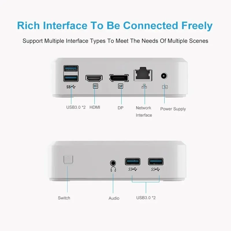 I/O: 4 x USB 3.0, 1 x HDMI2.0b, 1 x DP1.4, 1 x RJ45 LAN, 1 x 3.5mm Audio Jack, 1 x switch, 1 x DC IN