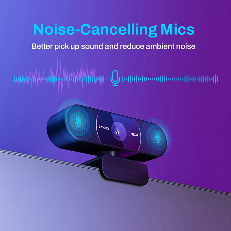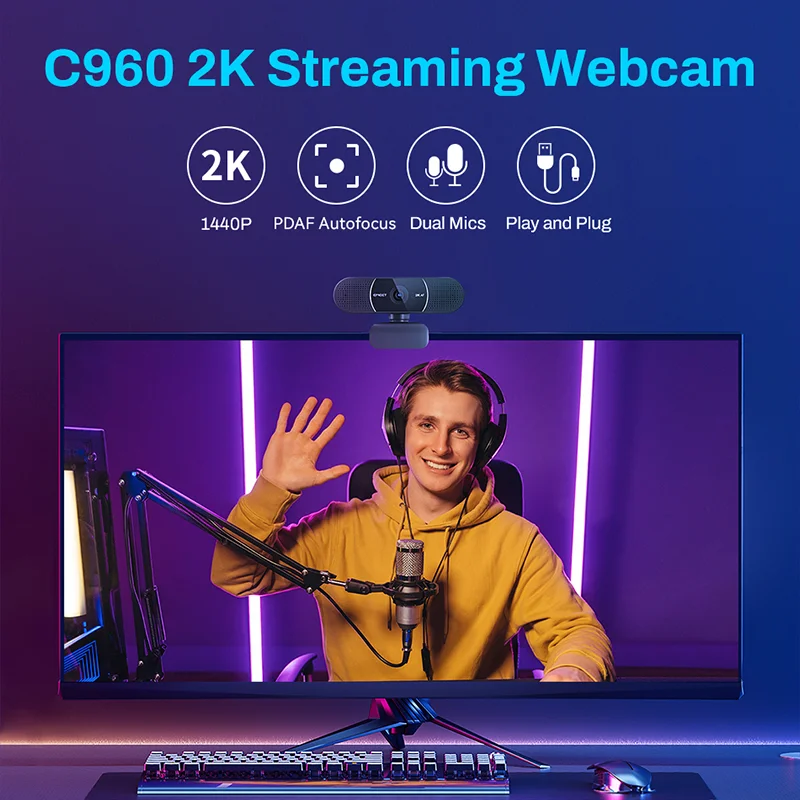 EMEET Streaming Webcam C960 2K2K High Resolution Webcam with Dual MicrophonesImmersive Imaging2K@30FPS provides high-quality image resolution, brings the best meeting experience for everyoneFast FocusingHigh-speed autofocus with PDAF tech ensuring you start the meeting right awayDual Noise Reduction MicsTwo noise-cancellation microphones with a pick up distance upto 8ft, combining with the latest noise-cancellation chip and AGC algorithm73°FOV, Focusing on YouThe 73°FOV optimized for your personal use, no extra background will be capture to distract the others or expose your locationAutomatic Light AdjustmentAutomatically optimizing your lighting conditions, making sure you staying sharp the whole timePersonalise your need & stay updatedUsing the EMEETLINK to personalise your setting to meet all your needs in different scenarios, also using the eMeetLink to continuously update your camera software.Flippable Privacy CoverFlip the privacy cover upward to start your wonderful video calls or flip it down to shelter the lens and protect your privacy immediatelyFor Different ScenesUniversal CompatibilityCompatible with all mainstream operation systems and meeting platformsEase of Use360°rotatable basepod, start your meeting within seconds, with no additional installation required, and use the time on other important jobs